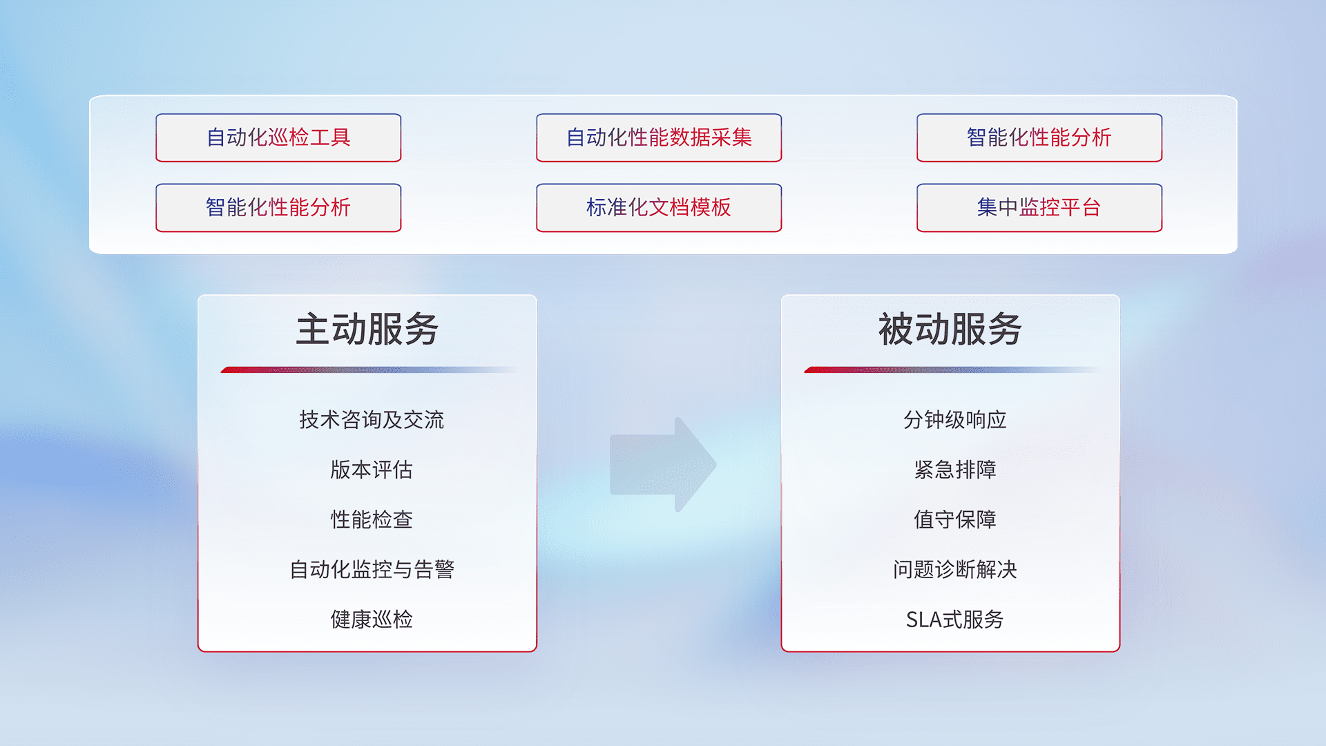 智能化工具和标准化文档,,保障服务质量,,提供主动服务(包含技术咨询、、、、版本评估、、性能检查、、、、自动化监控与告警、、健康巡检)和被动服务包含(分钟级响应、、紧急排障、、、值守保障、、、、问题诊断解决、、、、SLA服务)。。。